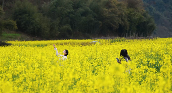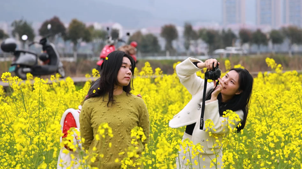 前来打卡的市民冯燕高兴地说:“这里油菜花面积大、景色美,我们特意约着朋友来拍舞蹈视频,风景超出预期,玩得特别开心。”