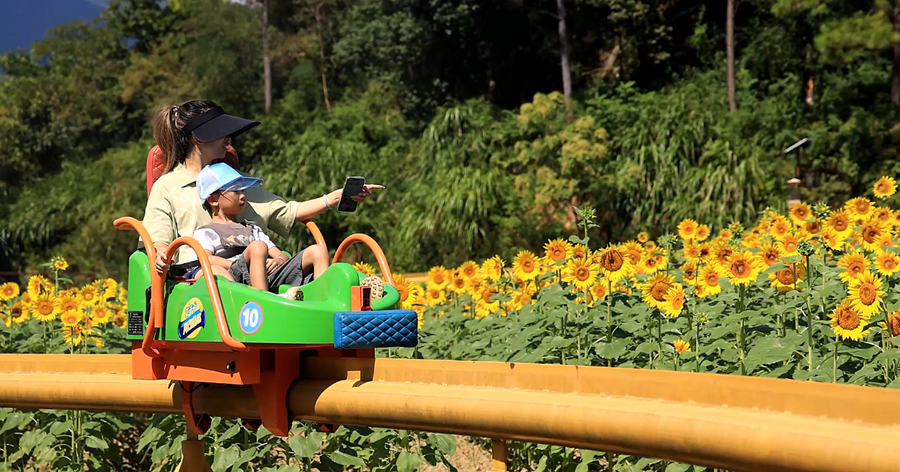 步入花千谷·月湖景区,连片向日葵向阳绽放,金色花浪与蓝天相映,勾勒出秋日绝美画卷。游客们或沿花径漫步,任花香萦绕鼻尖;或在花田旁定格笑脸,记录美好瞬间;花田小火车载着大人小孩穿梭花海,欢声笑语为这份秋日限定浪漫增添了灵动气息。景区负责人介绍,长假期间,景区精准契合游客“休闲+互动”需求,推出“花海景观+特色活动”组合套餐,人气持续攀升。