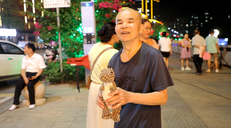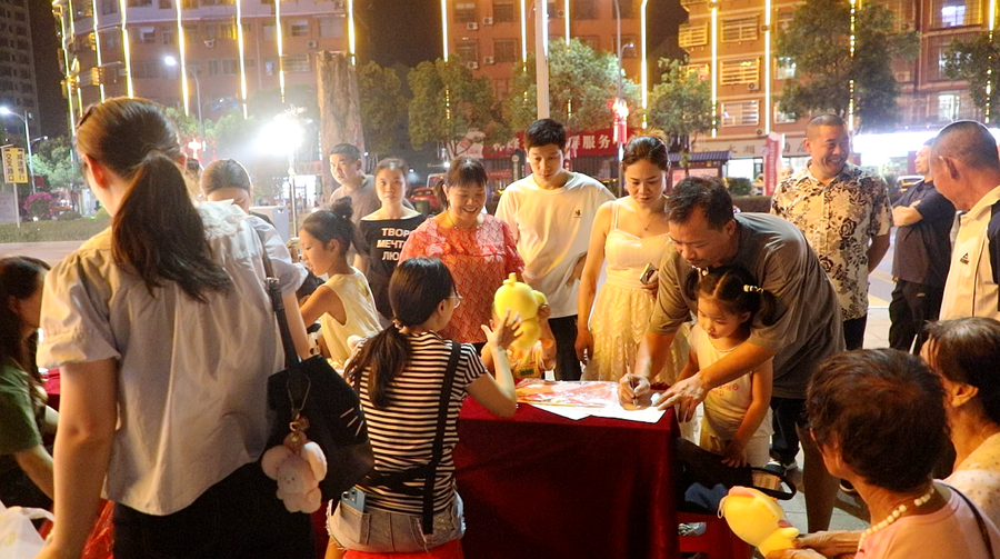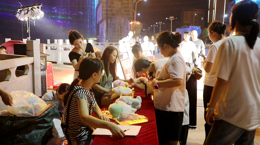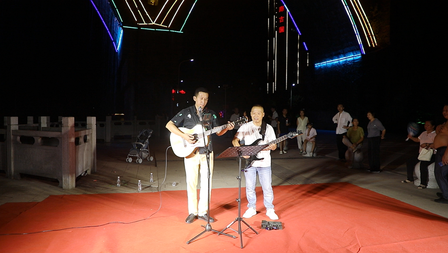 河畔另一侧,“河畔音乐会”同步营造着温馨浪漫的氛围。吉他弹唱的旋律在夜空中缓缓流淌,“自主点歌”环节更让市民游客化身“主唱”,伴着夜色与河风,用歌声抒发情感、传递欢乐。不少观众围坐一旁,或轻声和唱,或静静聆听,潇水河畔的夜晚因音乐更具诗意。不少参与者表示,这样的活动既有趣又有意义,希望能举办更多类似的文化体验活动。