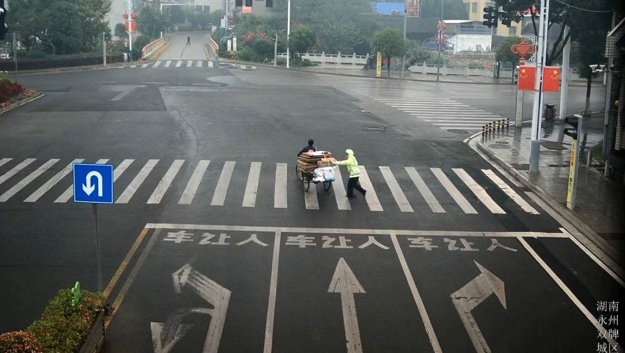 本网讯 (通讯员 双交办)近日,在双牌县双电西路十字路口,一位市民驾驶满载纸盒的三轮车过马路时,因货物重、堆积多,车辆在路口行驶困难。正在该路口执勤的交警发现情况后,立即上前查看。考虑到路口车流量大,车辆停滞易引发拥堵或安全隐患,交警毫不犹豫俯身推车助力。在其帮助下,三轮车顺利通过路口,及时化解现场麻烦。