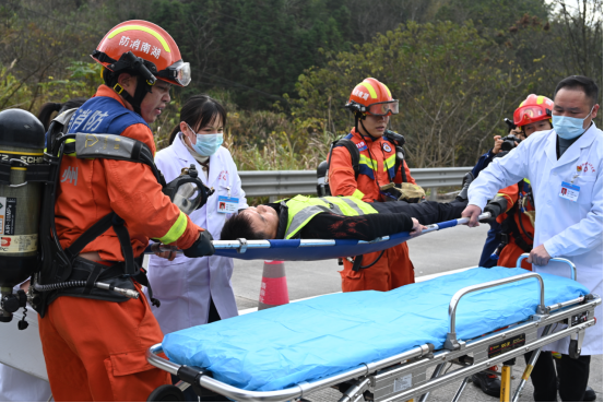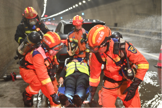 此次演练以实战化为导向,模拟轿车在阳明山隧道北行入口端超车道行驶时,因车速过快撞上检修道引发车辆起火、驾驶员被困场景。演练现场,各小组分工明确、协同作战:灭火组快速架设水带干线,出动灭火机器人降温灭火;破拆救援组携带专业装备进入隧道,通过热成像仪锁定被困人员位置,迅速破拆变形车门,成功解救被困人员。伤员转移至隧道入口后,医疗救护组立即开展初步救治并转运。火势扑灭后,救援人员持续对事故车辆冷却降温防止复燃,同步排查残留火种、复测隧道内气体浓度。永蓝高速工作人员对隧道消防设施进行全面检修,路政及清障人员有序清理路面残留物与事故车辆,随后逐步解除交通管制,各参演单位有序撤离,演练圆满结束。